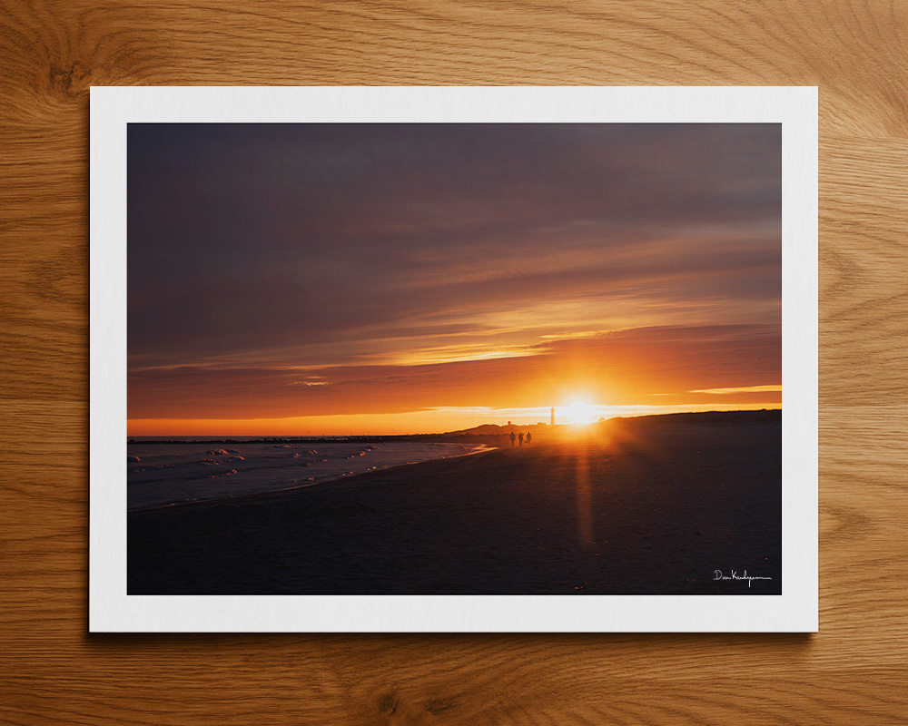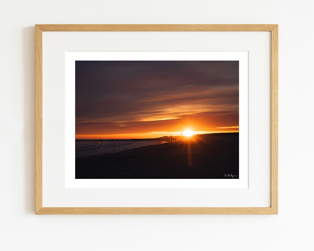 Printes på 240gsm kunstpapir i høj kvalitet, som gengiver solnedgangens varme farver og de fine detaljer i både hav og himmel – en stemningsfuld hyldest til Blåvand og Vesterhavet.