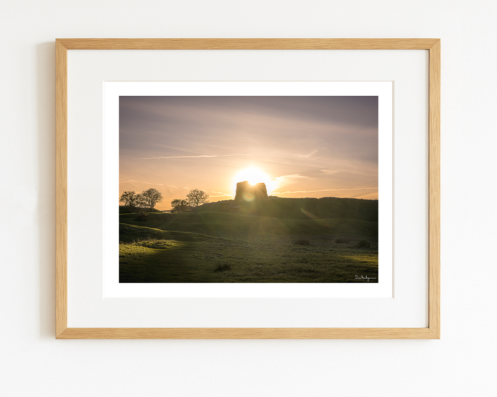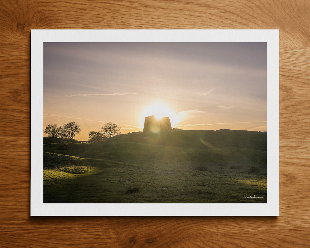 Kalø Slotsruin står majestætisk i solnedgangens sidste stråler. Det varme gyldne lys breder sig over det kuperede landskab og indhyller ruinen i en nærmest magisk atmosfære.