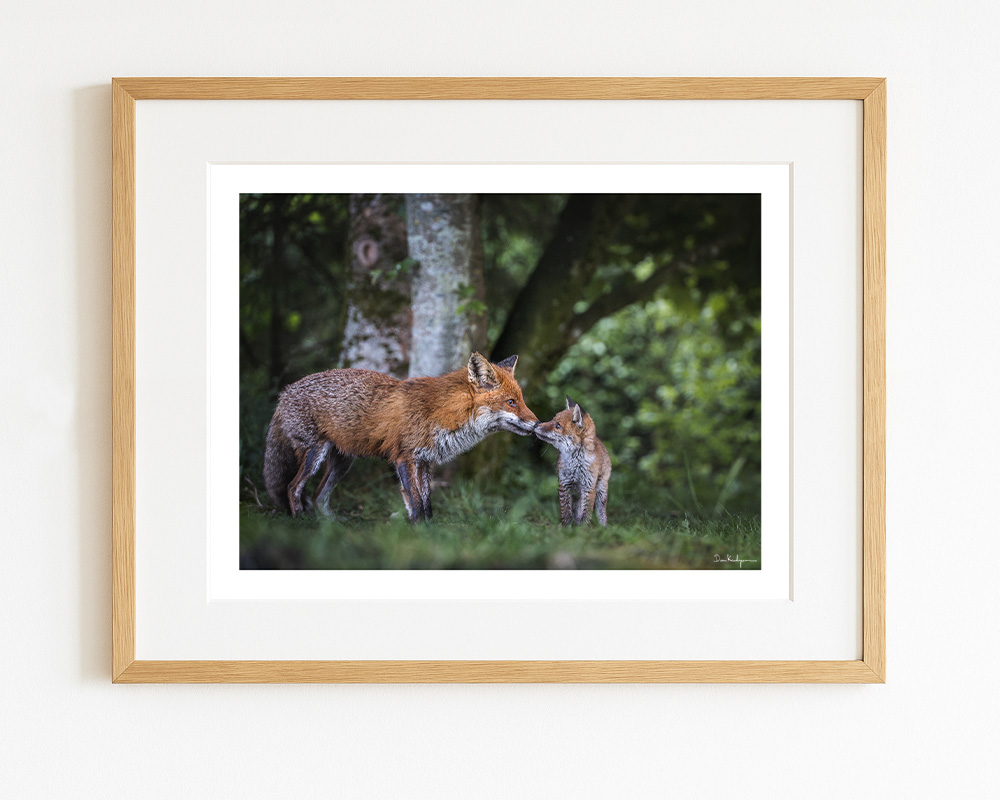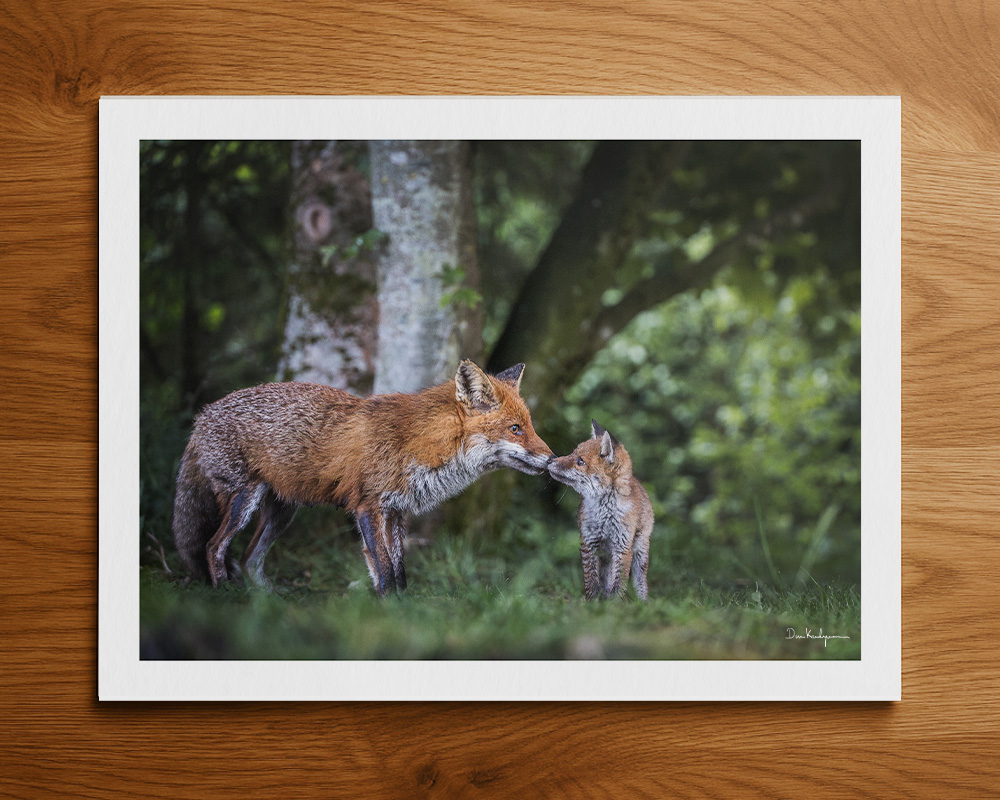 Printet på 240gsm kunstpapir i høj kvalitet, som gengiver pelsens tekstur, skovens grønne dybde og det fine lys med stor præcision. Et hjertevarmt motiv, der bringer naturens stille øjeblikke ind i hjemmet.