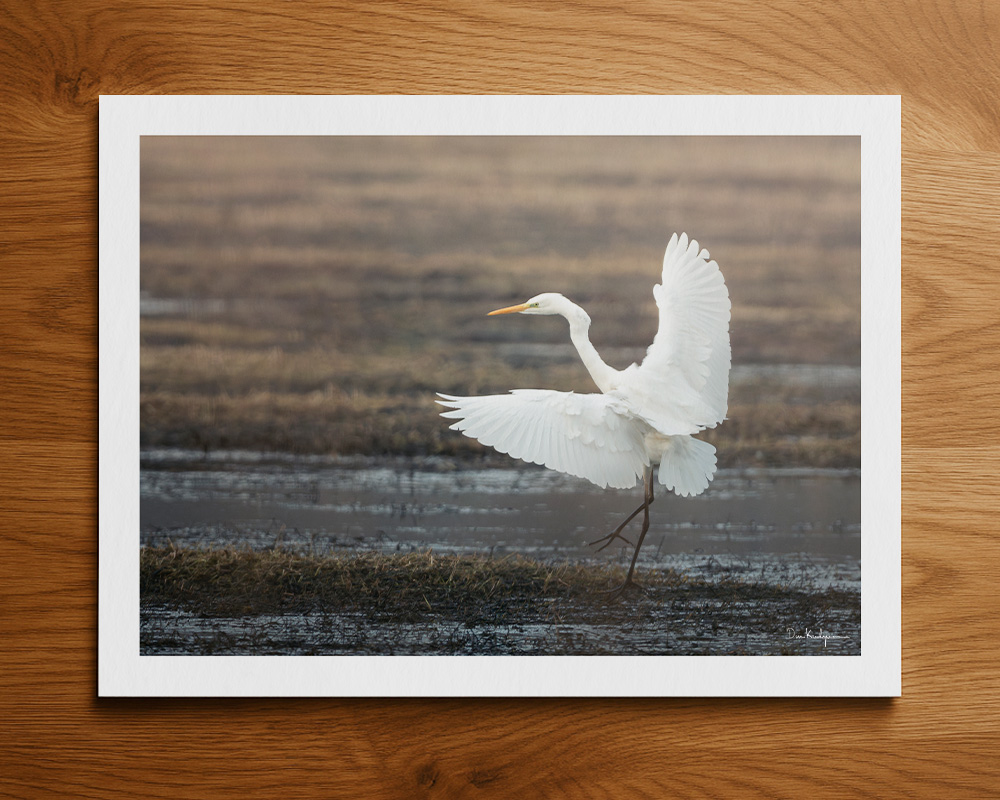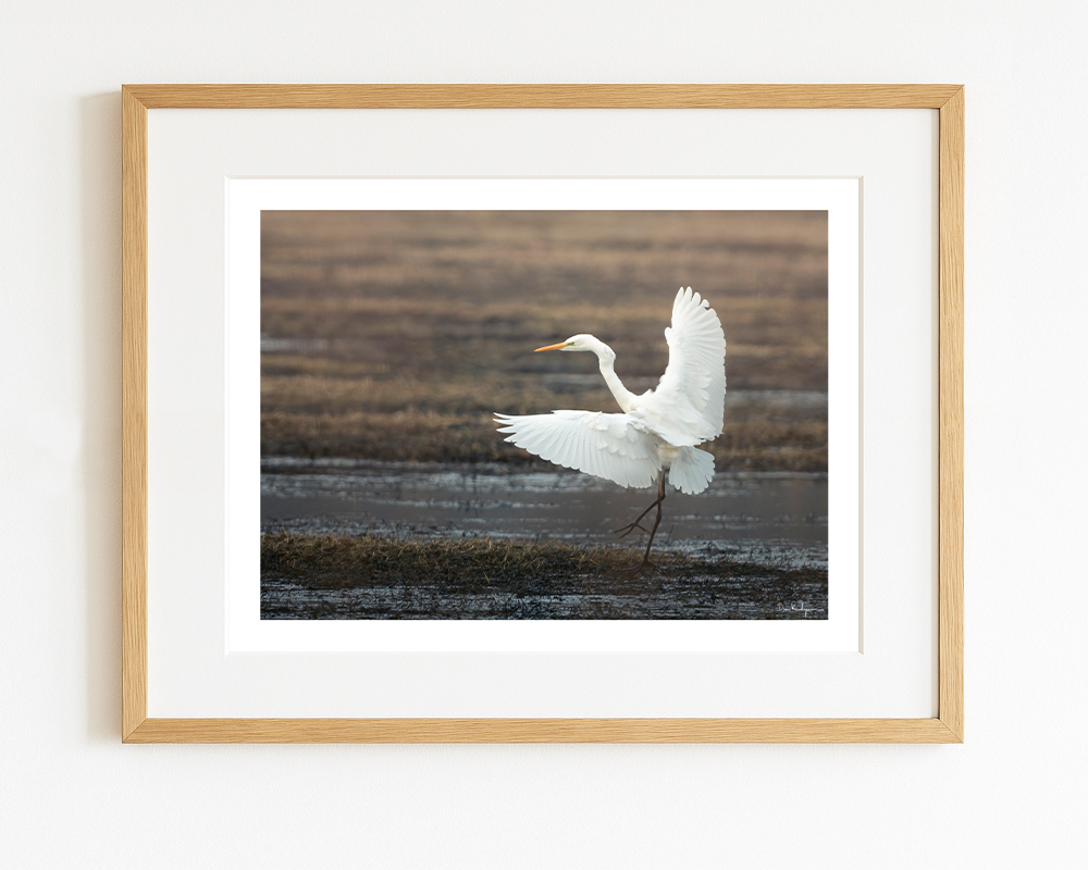 Et øjebliks elegance i vinterlyset. Denne sølvhejre, fanget i Kolindsund, løfter sig let over det våde landskab med vingerne fuldt udfoldet – en yndefuld silhuet mod det bløde, brunlige marskland.