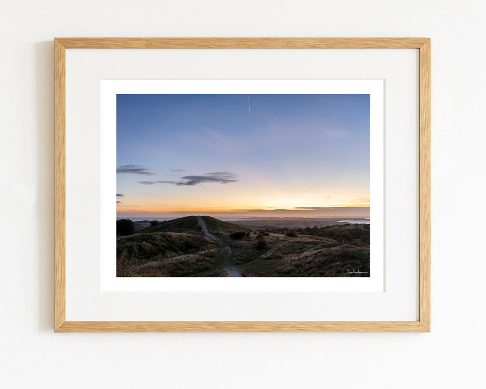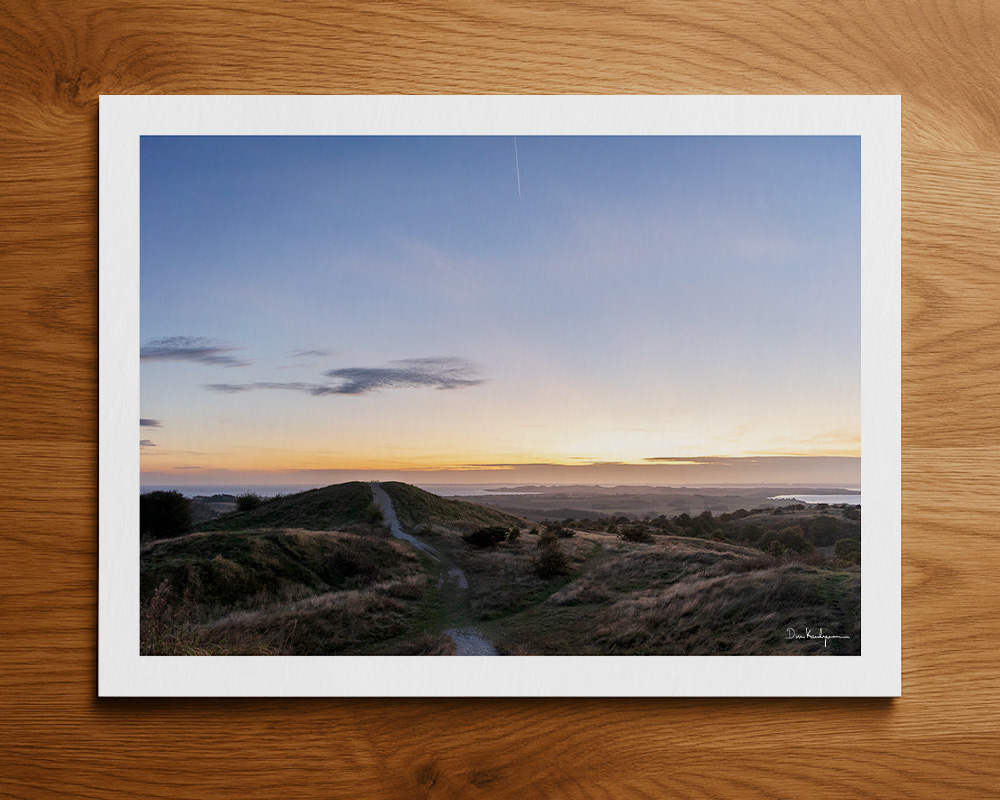Printet på 240gsm kunstpapir med høj kvalitet, der gengiver både himlens farver og landskabets former med stor dybde – et tidløst billede af et storslået dansk udsigtspunkt.